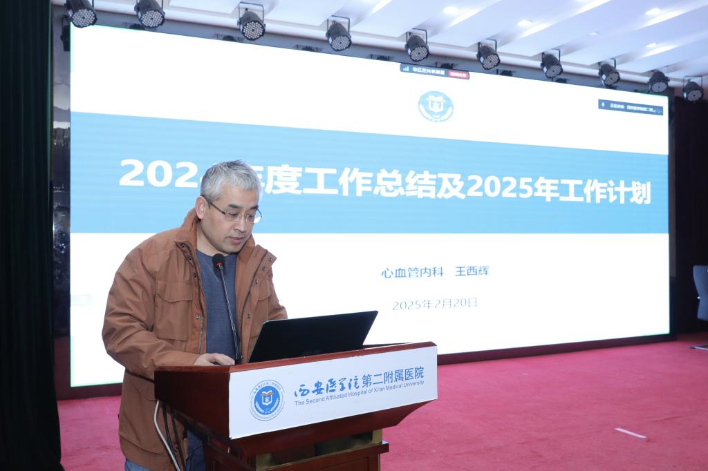 汇报结束后,院长赵海康发表了以《全心全意绘蓝图凝神聚力谋发展》为题的讲话。在讲话中对各科室2024年的辛勤付出与取得的成绩给予充分肯定,并指出过去一年是医院攻坚克难的关键年,全院职工凝心聚力,交出了一份亮眼的答卷。2025年是极其重要的一年,不仅是医院发展的关键时期,也是“十四五”收官之年,更是“十五五”奠定基础的开局之年。院长赵海康指出,2025年我们面临着环境形势变革、改扩建一期工程、信息化建设、老旧落后局面、设施老化、本科教育教学评估、三甲复审等七大挑战。面对新形势新挑战,他强调我们要从“专”、“精”、“特”、“新”等四大方面绘就未来。