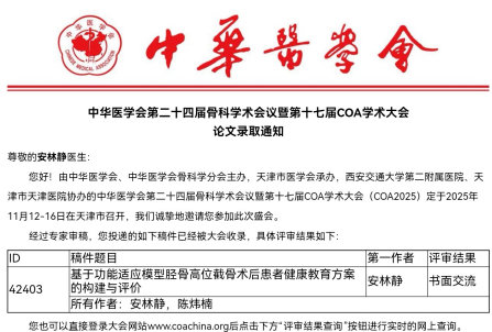 会前,我院骨科专业团队高度重视,积极组织,精心筹备参会事宜。经过大会学术委员会的严格评审,报送的多项学术成果凭借其创新性和临床价值脱颖而出,成功获得大会发言资格,并有多项研究入选电子壁报、书面交流等,在大会这一高水平的学术平台上,全面彰显了我院骨科专业团队的扎实功底与整体实力。