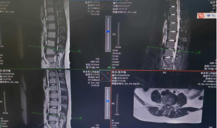 在柞水县人民医院骨科病区的走廊里,14岁的张同学手扶护栏,身体蜷曲,每一次挪动都伴随着难忍的疼痛,眉头紧锁的他忍不住低声呻吟,腰椎间盘突出引发的剧痛,正无情吞噬着这个少年的青春活力。此前,张同学因“腰痛伴左下肢放射痛1月余”在外院接受保守治疗,却始终未见成效。为寻求进一步救治,他来到柞水县人民医院就诊。我院支医专家姚亚波与该院骨科鲁家军主任共同接诊,通过详细询问病史、细致体格检查,并结合腰椎MRI平扫结果,明确诊断其为腰椎间盘突出伴坐骨神经痛。影像报告显示,张同学腰椎生理曲度变直,腰2-3、3-4椎间盘轻度膨出,腰4-5椎间盘膨出并中央偏右型突出,腰5-骶1椎间盘轻度中央型突出。