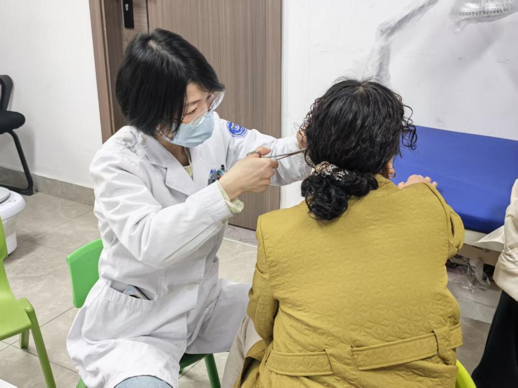 铂悦社区党支部书记张瑞钰祺对医院党委的关心与支持表示感谢。她表示,“中医健康小屋”的建成启用,切实解决了社区居民在中医诊疗、养生保健等方面的实际需求。通过健康科普、中医推拿、针灸理疗、节气养生指导等多种形式的共建活动,让居民在家门口就能享受到专业、便捷、贴心的中医健康服务,有效提升了社区居民的健康获得感和生活幸福感。随后,徐曦书记一行参观了社区活动室及义诊活动现场。正值元宵佳节,内科第七党支部(中医科)的医护团队正在开展义诊服务,中医推拿、针灸、耳穴贴压等传统中医疗法吸引了众多社区居民踊跃参与。