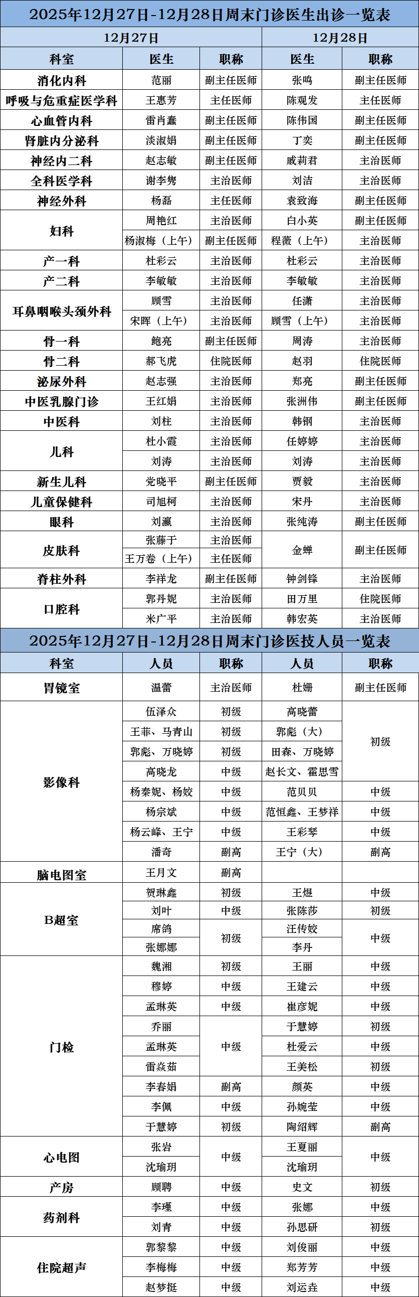 周六、周日门诊医生出诊表