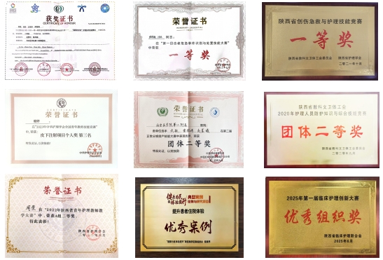 近年来共荣获国家级奖项29项,省级奖项63项,包括全国医院品管圈大赛“一等奖”、全国第二届正常分娩接产技能大赛二等奖、中华护理学会全国青年教师技能竞赛“团体二等奖”、陕西省创伤急救与护理技能竞赛“团体一等奖”、中国智慧医院案例交流大赛QCC专场“一等奖”三项、第一届全国新生儿复苏技能大赛二等奖、陕西省创伤急救与护理技能竞赛“团体一等奖”、2023年陕西省第一目击者危急事件识别和处置技能大赛一等奖等荣誉。同时作为教学医院,承担西安医学院护理学专业理论及实验课程、护理实习及见习、进修护士培训等任务。科研与教改领域成果丰硕,省级、厅局级科研课题及省、校级教学改革课题立项数量再创新高;指导大学生技术技能大赛团队勇夺西南西北赛区一等奖、二等奖,并在全国总决赛中斩获三等奖。