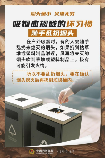 确保烟头完全熄灭。最好用水浸湿后再丢弃于指定的、不易燃的容器内。绝对禁止将未熄灭的烟头随手扔进垃圾箱或窗外。
