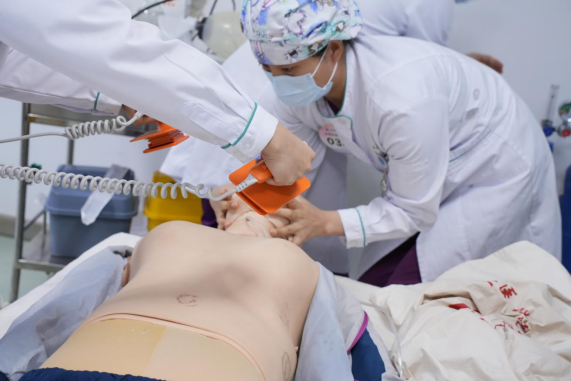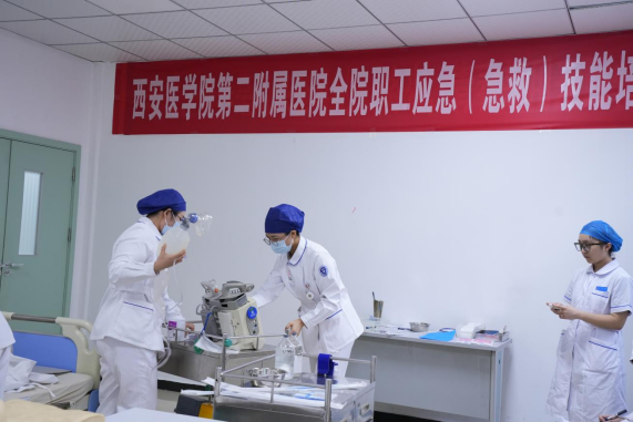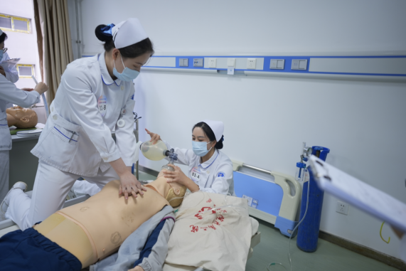 竞赛在实训中心紧张进行,赛场模拟真实急救场景,参赛团队需在限定时间内完成病情评估、急救操作及团队协作,重点考核心肺复苏、电除颤、简易呼吸气囊等急救技能。