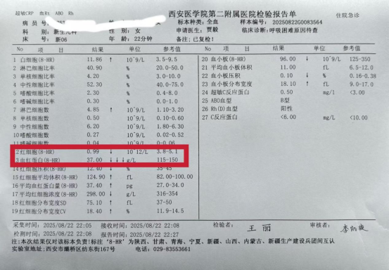 在新生儿科副主任医师张东平的带领下,主治医师贾毅、主管护师武佩佩、护士居姣姣及唐荣等护理骨干迅速组成救治小组,全力投入救治。检查结果令人揪心:新生儿正常血红蛋白值为170-220g/L,而小雪儿的血红蛋白仅为正常值的五分之一,极重度贫血合并心力衰竭,脑钠肽高达89136pg/ml!