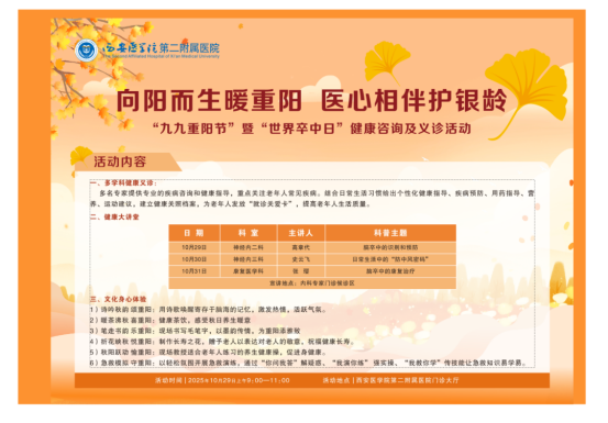 岁岁重阳,今又重阳。当“登高敬老”的传统佳节与“守护生命”的世界卒中日温暖邂逅,我院多学科医疗团队怀揣对银龄群体的深切关怀,以传承民俗、守护健康为念,精心策划并开展了“向阳而生暖重阳 医心相伴护银龄”主题活动。活动将传统节日的脉脉关怀浸润在专业的医疗服务中,为老年朋友送上精准的健康评估与支持,更让尊老、敬老、爱老的美德在医者仁心中静静流淌。