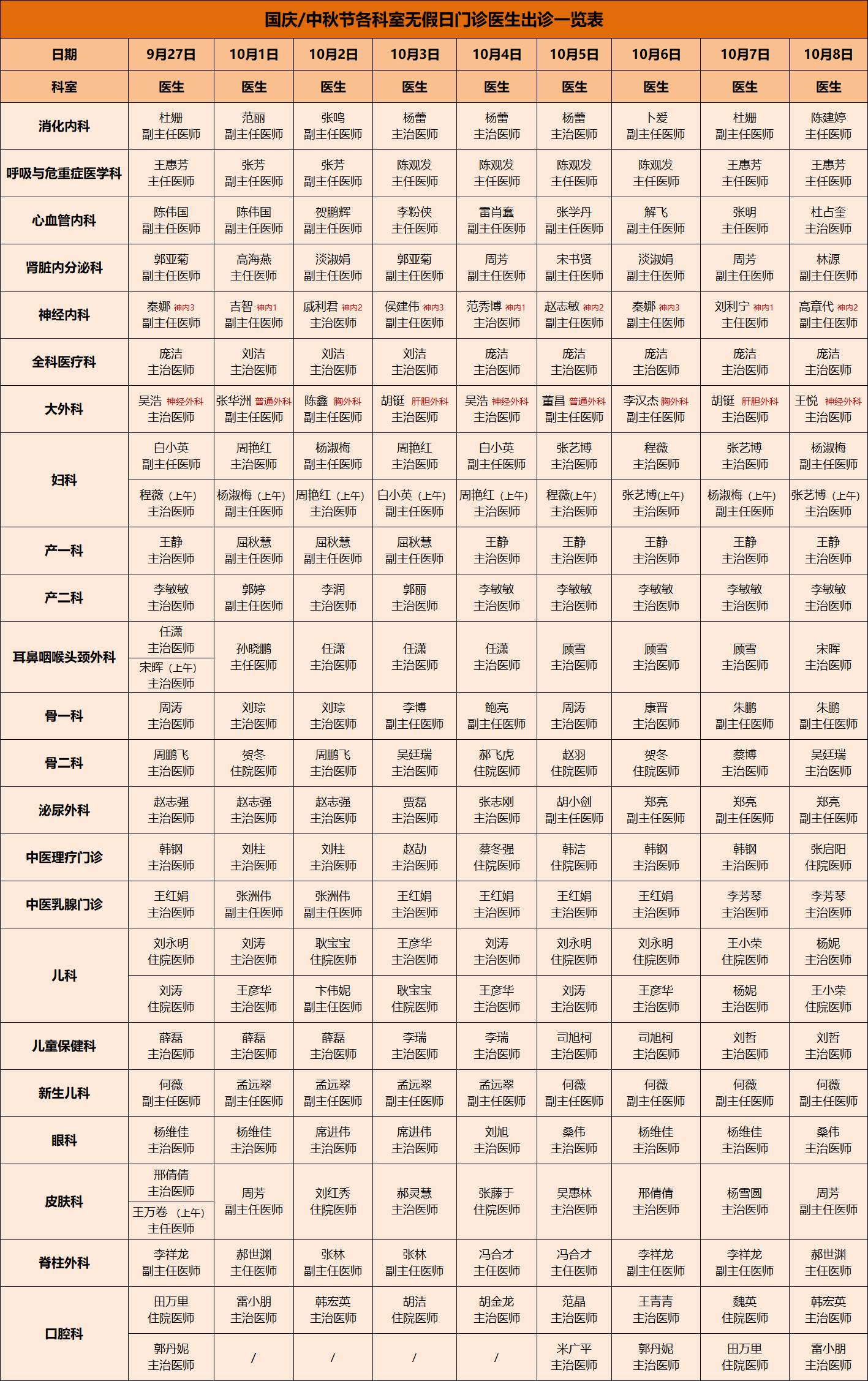 一、9月27日、10月1日至8日为无假日门诊,参照“国庆/中秋节门诊医生出诊信息一览表”出诊。