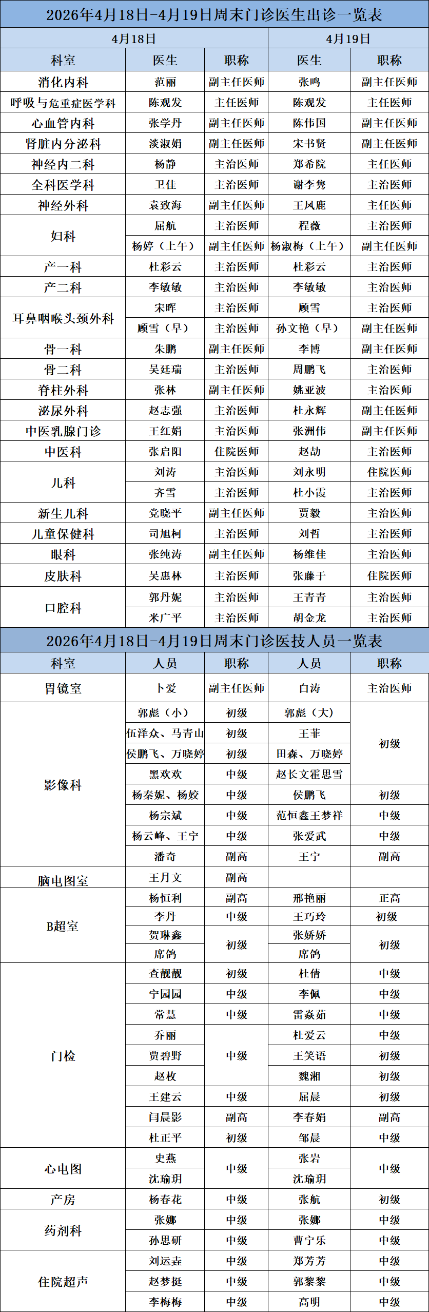 周六、周日门诊医生出诊表