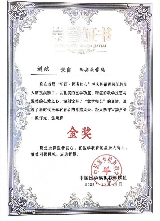 我院刘洁老师斩获全国智慧医学教育大赛金奖,总排名高居全国第三!在近日落幕的首届“华西·医者初心”最强医学教学大脑挑战赛中,全科教研室刘洁老师凭借扎实的医学功底、精湛的教学技艺与温暖的仁爱之心,从全国40余所院校的130名选手中脱颖而出,历经复赛、决赛两轮激烈角逐,斩获佳绩。尤其在“教师评分挑战AI评价”环节表现出色,充分彰显了我院模拟医学教育的过硬实力。